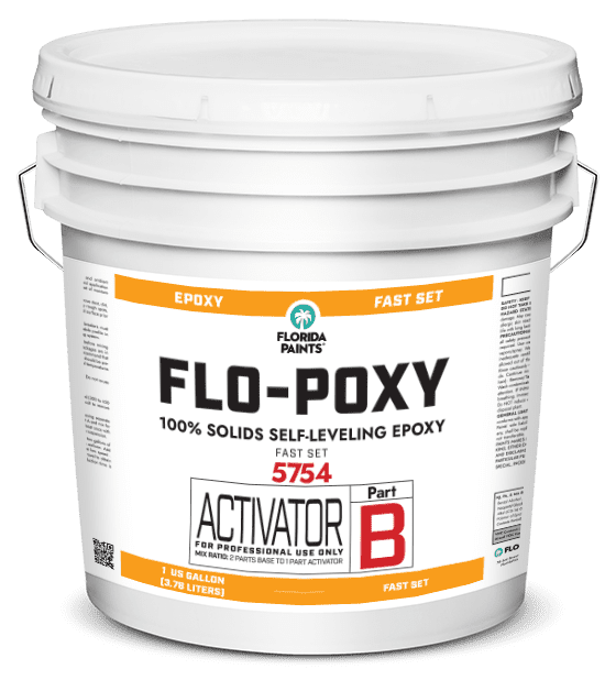 Flo-Poxy FS 100% Solids Fast Set Epoxy Floor Coating is a specially formulated part-B component for the part-A of 5740 Flo-Poxy two-component, hi-performance chemical resistant gloss epoxy for applications when a faster re-coat time is required. It provides a high build, seamless, and abrasion resistant floor. It is a low VOC and low odor gloss coating with excellent chemical, abrasion, and stain resistance. It can be applied in a solid color or used as a primer and color basecoat for chip or quartz decorative floors.